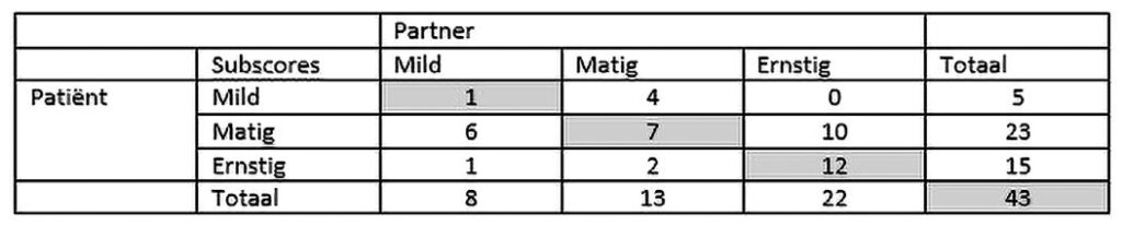 Uit het onderzoek bleek dat het knap lastig is om de plasklachten van een de partner adequaat in te schatten: slechts 46,5% scoorden in dezelfde categorie! Zie hieronder de tabel met in het grijs de proefpersonen die in dezelfde categorie (mild, matig of ernstig) scoorden in het wit alle proefpersonen in een verschillende catego-rie. Ook als gekeken werd naar de vragen apart en naar de onderde-len ‘obstructie’, ‘overactiviteit’ of ‘kwaliteit van leven’, was de over-eenkomst mager, waarbij ‘overactiviteit’ wel het beste uit de bus kwam: hoe vaak iemand in de nacht eruit moet om te plassen is ook makkelijker in te schatten dan of iemand na het plassen nog het idee heeft niet leeg te zijn.