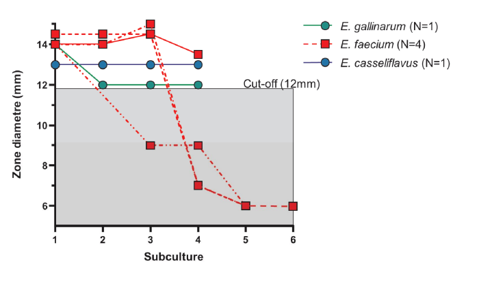 In totaal zijn er door beide laboratoria 479 kweken met enterokok-ken onderzocht. Deze kweken werden onder andere genomen uit buikvocht, bloed, urine en longvocht. In 27 van deze 479 kweken (5.6%) zijn vancomycine resistente genen aangetroffen. Achttien van deze 27 kweken waren al vancomycine resistent bij de eerste meting; negen kweken bleken mogelijk gevoelig om alsnog resis-tentie te kunnen ontwikkelen. Van deze negen kweken waren er zes beschikbaar om te kijken of deze alsnog resistentie kunnen ontwik-kelen voor vancomycine.